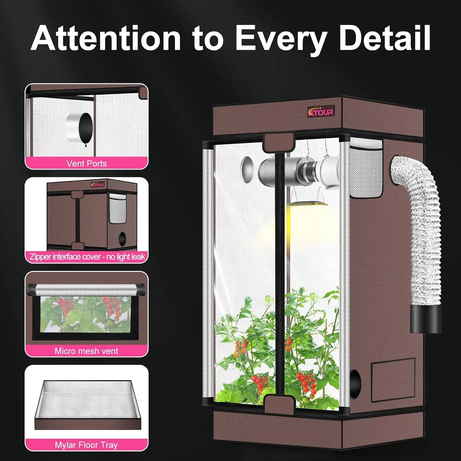 High-Quality Materials: Crafted from durable 1680D Oxford canvas, this grow tent features double-stitched construction for tear resistance and long-lasting use. It effectively contains all light within the tent to optimize plant growth. Reliable zippers ensure smooth operation, while a stable metal frame provides firm support without shaking. Highly Reflective Interior: The tent is lined with silver reflective polyester film that enhances light reflection from your indoor grow lamps, boosting plant growth efficiency. This waterproof layer helps maintain consistent temperatures over extended periods, promoting healthy development for plants, flowers, fruits, and vegetables. Easy Observation Features: Designed with a double-door system for convenient monitoring. The outer door is 99% light-proof to block external light effectively. An inner transparent sealed door allows easy peeking inside without frequent opening, minimizing disturbance to plants. A waterproof floor tray prevents leaks and keeps your space clean. Simple Assembly Process: This complete kit requires no tools for setup and comes with clear instructions and all necessary parts. Even beginners can quickly assemble it to create an efficient hydroponics environment. Proper air circulation is ensured to maintain fresh air inside the tent for optimal plant health. Versatile Applications: With a large opening design, the tent accommodates duct fans, lights, wires, and other equipment easily. Available in various sizes to suit different spaces like apartments, basements, balconies, or greenhouses. Ideal for indoor planting enthusiasts seeking a reliable solution for cultivation needs.