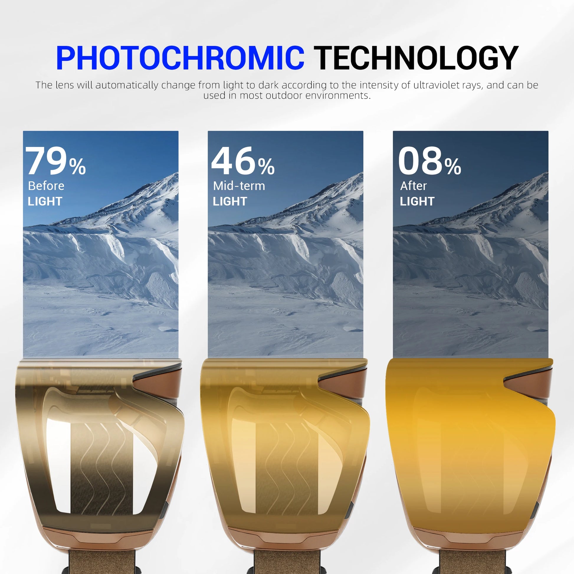 ⛷️Photochromic lenses: When exposed to UV sunlight outdoors, the lenses will change color according to the intensity of the UV rays. The stronger the UV rays, the darker the lens color will become.