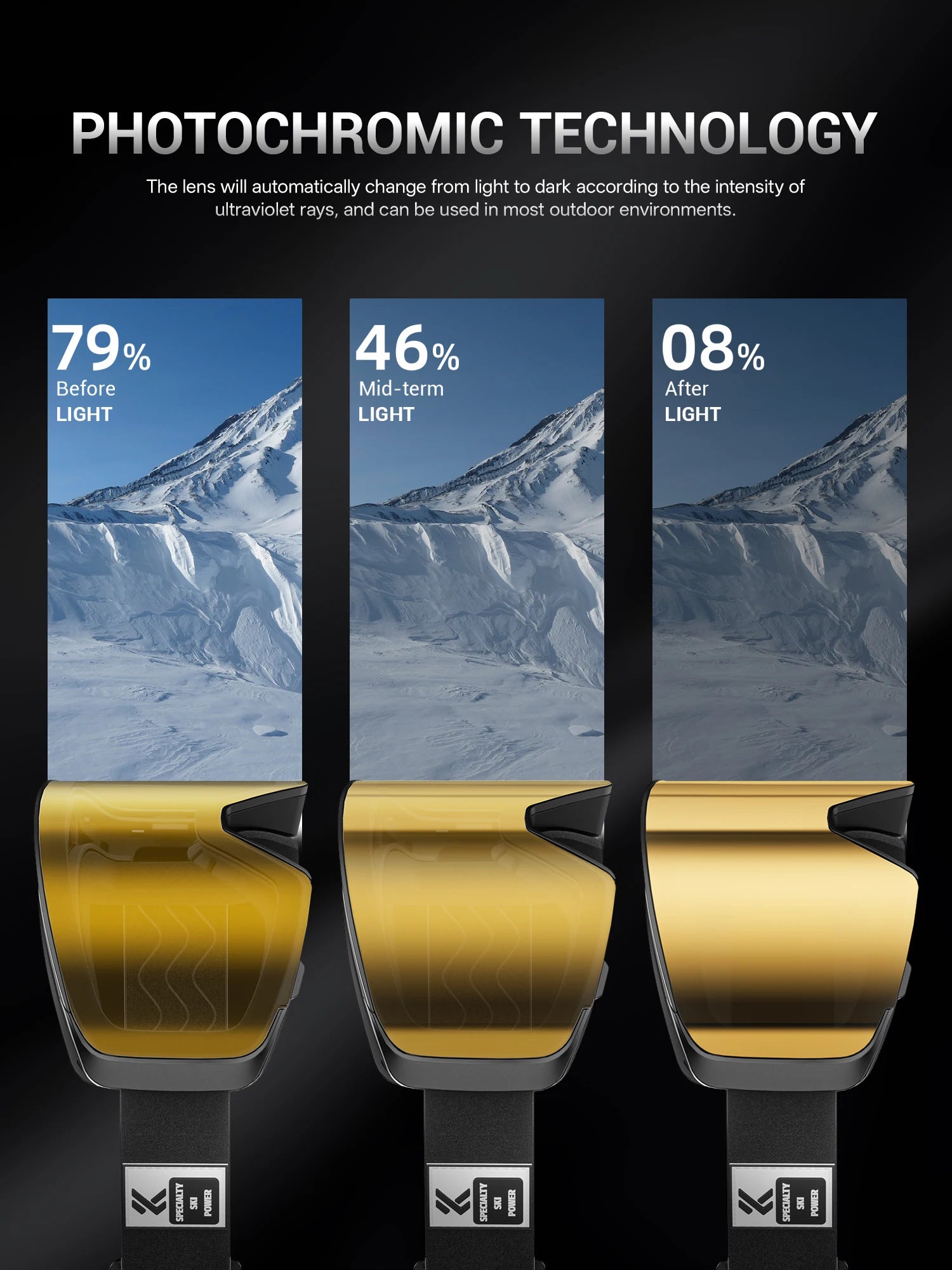 ⛷️Tecnology photochromy: The KAPVOE ski goggles use photochromic technology. The lenses change colour according to UV intensity, adapt to different weather conditions and can be used both during the day and at night, improving the snow viewing angle. In addition, the oleophobic layer on the surface can dissipate the melted snow water smoothly without leaving a trace.